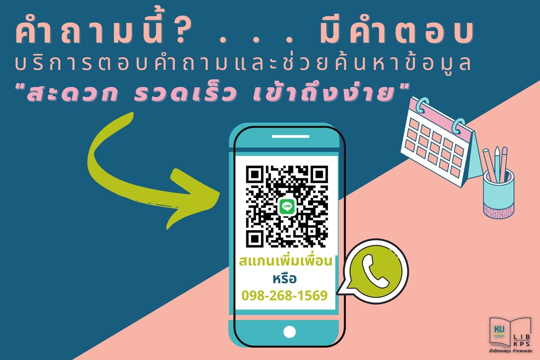 บริการตอบคำถามและช่วยค้นหาข้อมูล ผ่านโทรศัพท์ 098-268-1569 และ Line Application (Line ID: serlib) เป็นบริการที่ให้คำแนะนำและตอบคำถามให้ผู้ใช้บริการสามารถค้นคว้าสารสนเทศที่ตนเองต้องการได้โดยการสืบค้นจากระบบฐานข้อมูลของห้องสมุด เพื่อให้ผู้ใช้บริการทราบว่าสารสนเทศที่ตนเองต้องการมีหรือไม่ ประเภทใด จำนวนเท่าไหร่ และจัดเก็บอยู่ที่ไหน ให้บริการค้นหาสารสนเทศที่มีอยู่ในห้องสมุดและแหล่งสารสนเทศอื่นๆ เพื่อช่วยให้ผู้ใช้บริการได้รับข้อมูลที่ต้องการได้อย่างสะดวก รวดเร็ว และถูกต้อง